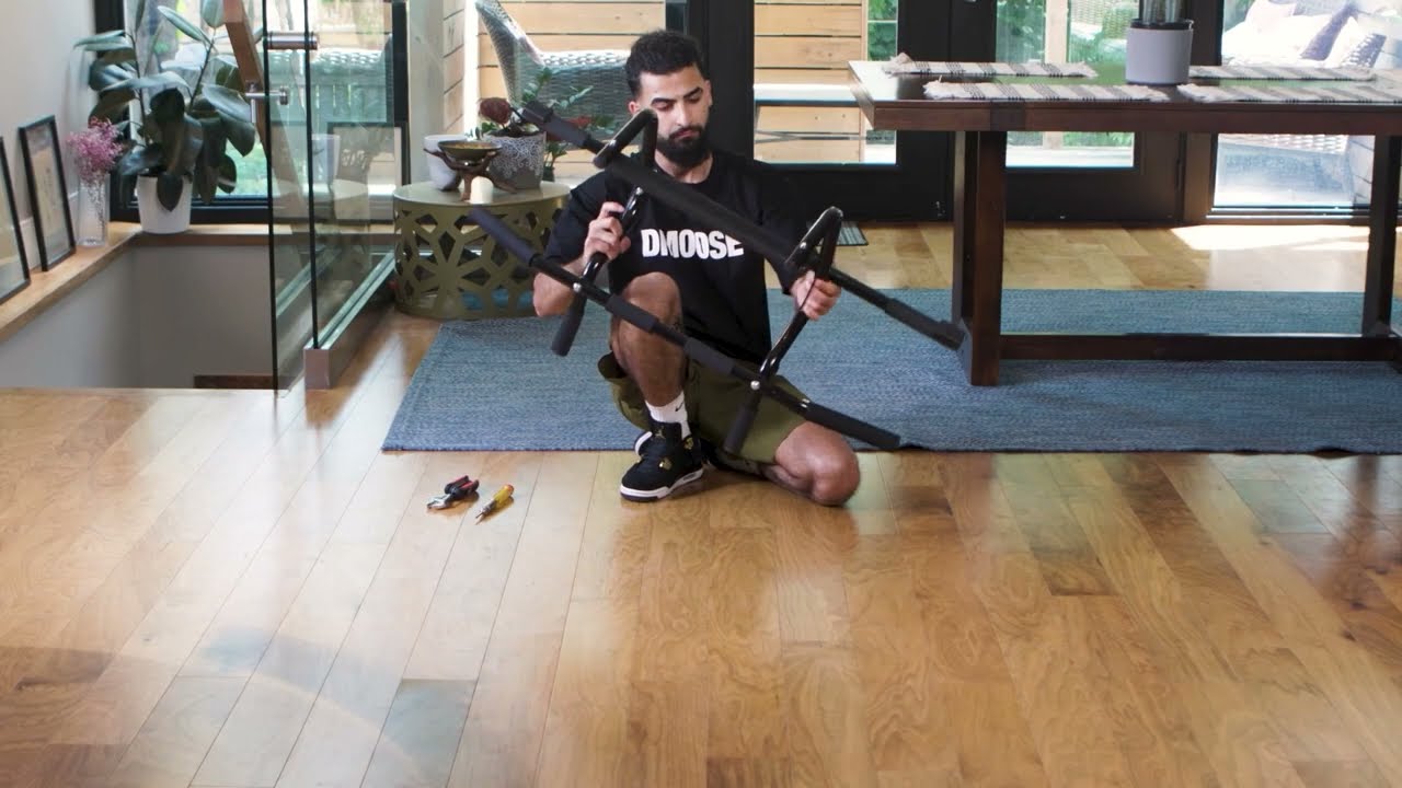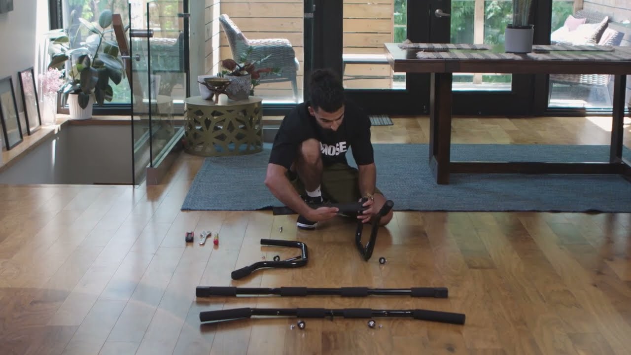 Minimal assembly is required. The bar comes in a few parts that need to be bolted together, but the process is straightforward and only takes a few minutes. Once assembled, it can be mounted and removed from your doorway in seconds.